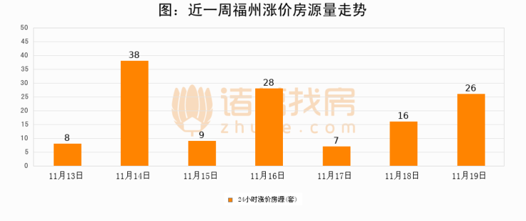 根据诸葛找房数据显示,福州24小时涨价房源量为26套,较11月18日增加10套,环比上涨62.5%。与此同时,涨价房源占比小幅扩大,业主信心有所提升。