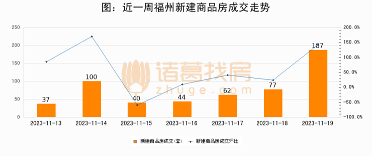 根据福州市不动产登记和交易中心数据显示,2023年11月19日福州新建商品房成交187套,较昨日增加110套,环比上涨142.9%
