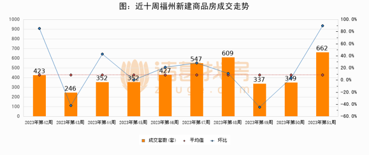 进入2023年第51周(12月11日-12月17日),福州新建商品房成交662套,较上周增加313套,环比上涨89.7%