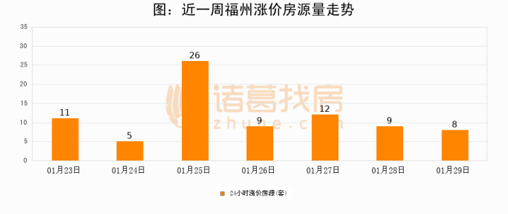 根据诸葛找房数据显示,福州24小时涨价房源量为8套,较01月28日减少1套,环比下降11.1%。与此同时,涨价房源占比小幅回落,对于购房者来说是一个入市窗口期,购房者可抓住时机入市。