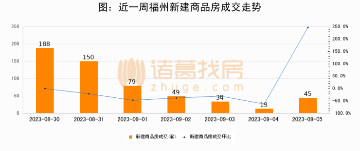 根据福州市不动产登记和交易中心数据显示,2023年09月05日福州新建商品房成交45套,较昨日增加32套,环比上涨246.2%