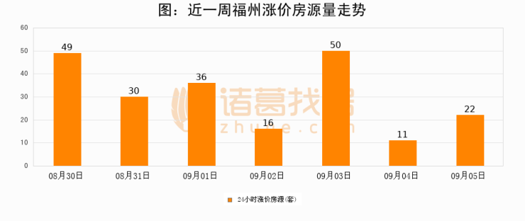 根据诸葛找房数据显示,福州24小时涨价房源量为22套,较09月04日增加11套,环比上涨100%。与此同时,涨价房源占比小幅扩大,业主信心有所提升。