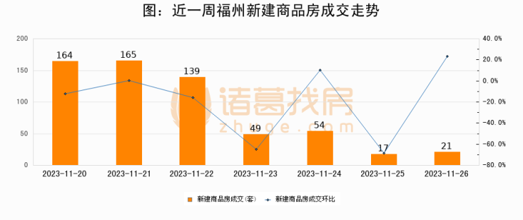 根据福州市不动产登记和交易中心数据显示,2023年11月26日福州新建商品房成交21套,较昨日增加4套,环比上涨23.5%