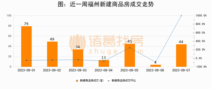 根据福州市不动产登记和交易中心数据显示,2023年09月07日福州新建商品房成交44套,较昨日增加40套,环比上涨1000%