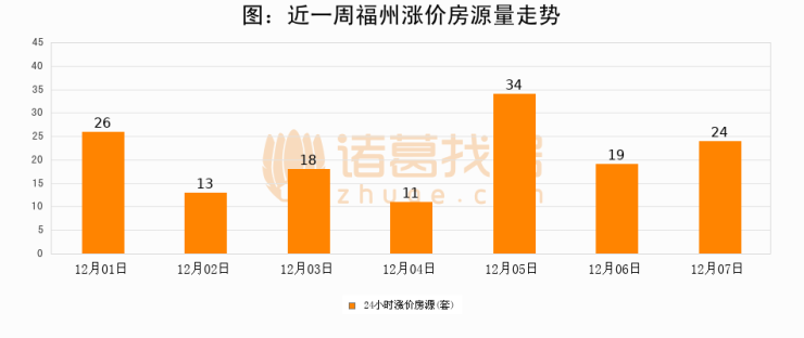 根据诸葛找房数据显示,福州24小时涨价房源量为24套,较12月06日增加5套,环比上涨26.3%。与此同时,涨价房源占比小幅扩大,业主信心有所提升。