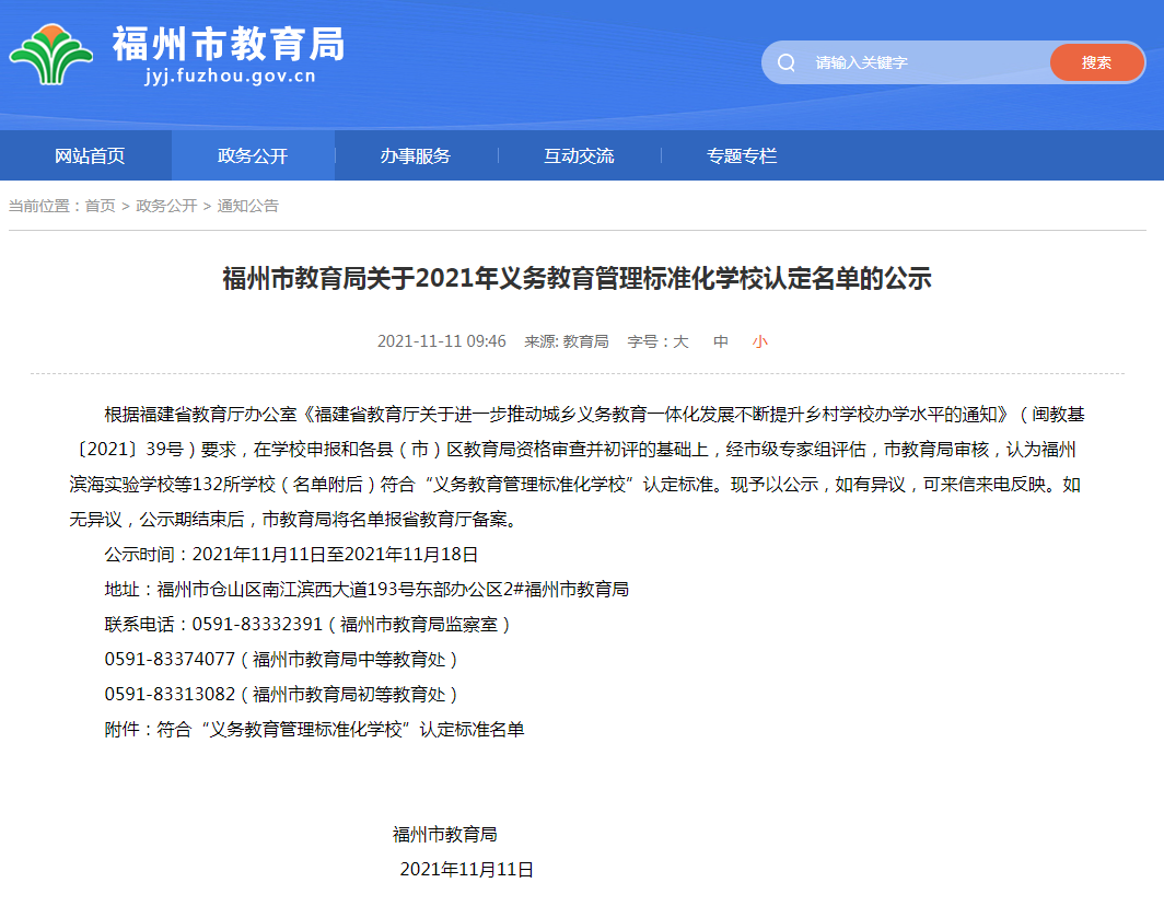 根据福建省教育厅办公室《福建省教育厅关于进一步推动城乡义务教育一体化发展不断提升乡村学校办学水平的通知》(闽教基〔2021〕39号)要求,在学校申报和各县(市)区教育局资格审查并初评的基础上,经市级专家组评估,市教育局审核,认为福州滨海实验学校等132所学校(名单附后)符合“义务教育管理标准化学校”认定标准。现予以公示,如有异议,可来信来电反映。如无异议,公示期结束后,市教育局将名单报省教育厅备案。