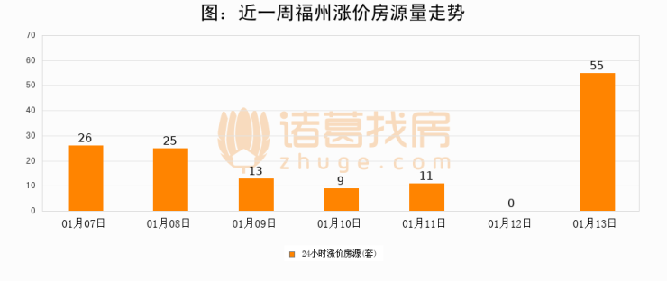 根据诸葛找房数据显示,福州24小时涨价房源量为55套,较01月12日增加55套,环比上涨0%。与此同时,涨价房源占比小幅扩大,业主信心有所提升。