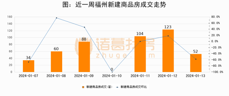 根据福州市不动产登记和交易中心数据显示,2024年01月13日福州新建商品房成交52套,较昨日减少71套,环比下降57.7%