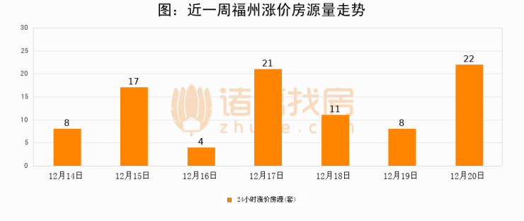 根据诸葛找房数据显示,福州24小时涨价房源量为22套,较12月19日增加14套,环比上涨175%。与此同时,涨价房源占比小幅扩大,业主信心有所提升。