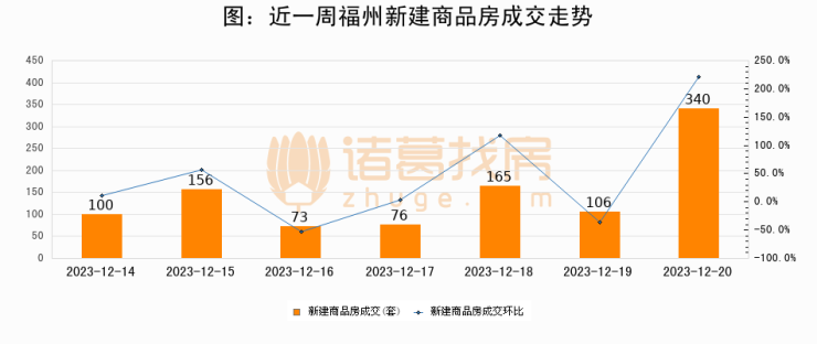 根据福州市不动产登记和交易中心数据显示,2023年12月20日福州新建商品房成交340套,较昨日增加234套,环比上涨220.8%