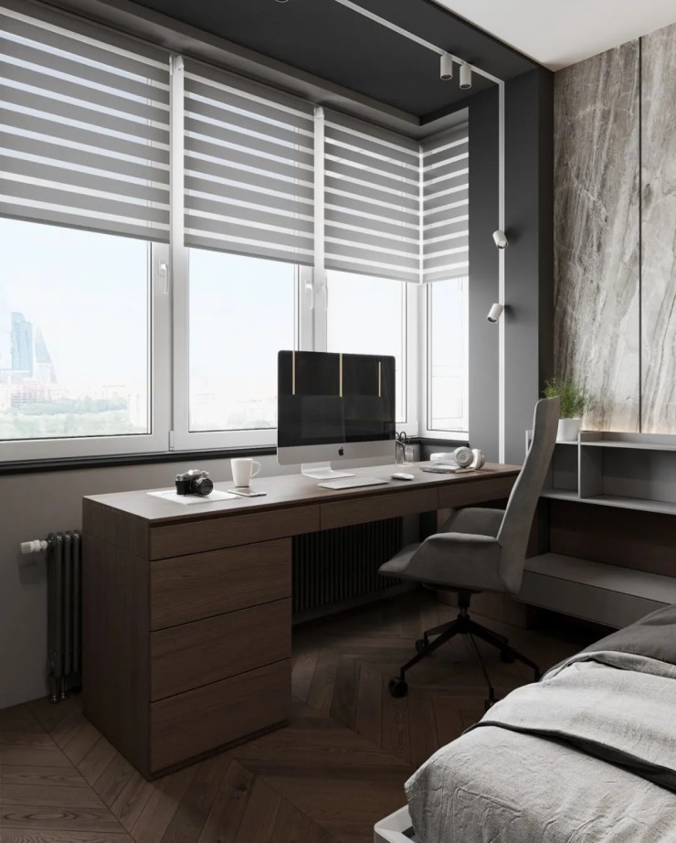 客卧延续灰色简约的格调,直线条依然是装饰的主角。靠窗的工作台有着充足的视野光线,营造良好的学习和工作环境。