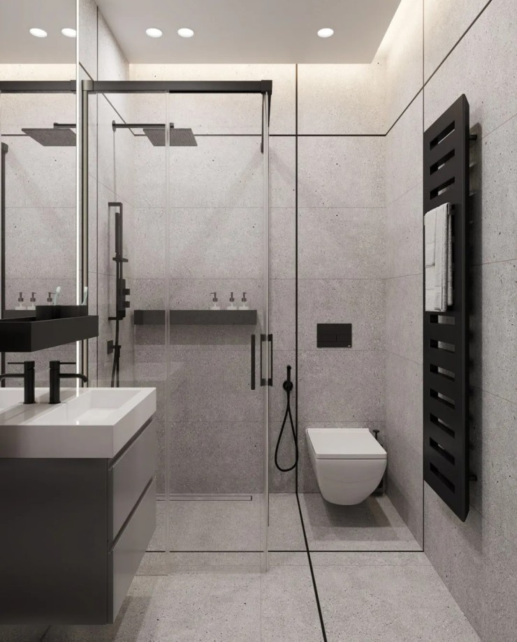 次卫水泥板的清逸气息弥漫整个空间,去繁就简,加以黑色线条在空间游走,丰富灵动空间。透明玻璃推拉门的使用不仅节省了空间,也让整个卫生间显得更加整洁明亮。