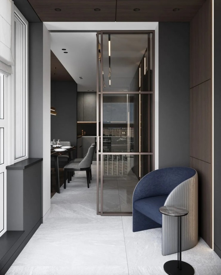 小小的阳台部分也被设计得高级舒适,简约不带一条多余的线条与装饰,全包式的玻璃窗引入充足的光线。木板从天花顶垂落的墙面,静谧惬意的感觉被呈现于阳台空间。