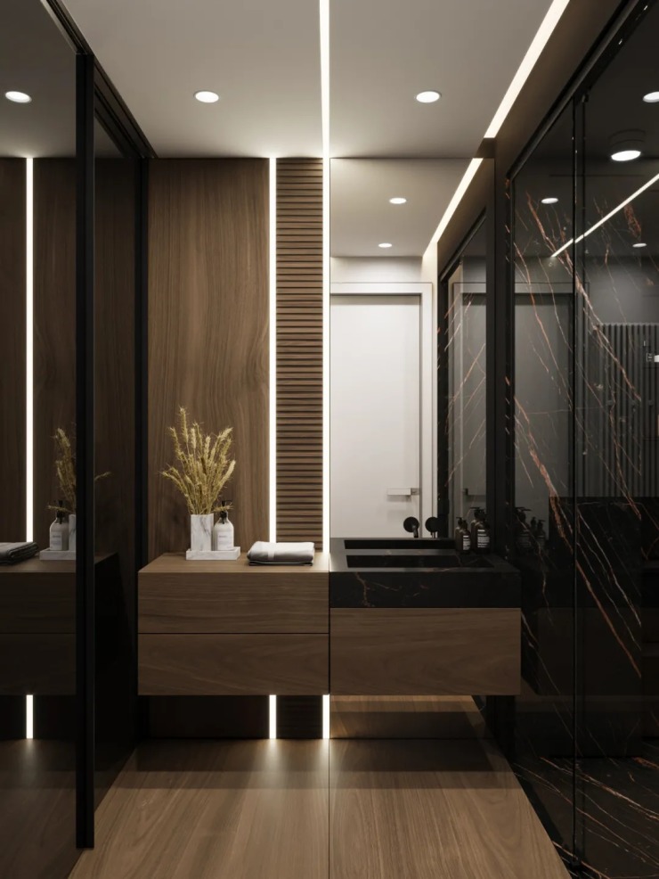 浴室黑色大理石的华丽狂野的纹理与色彩在空间中绽放出大气高雅的冷艳气息,天然稳重的木材填补了柔和的视觉触感。