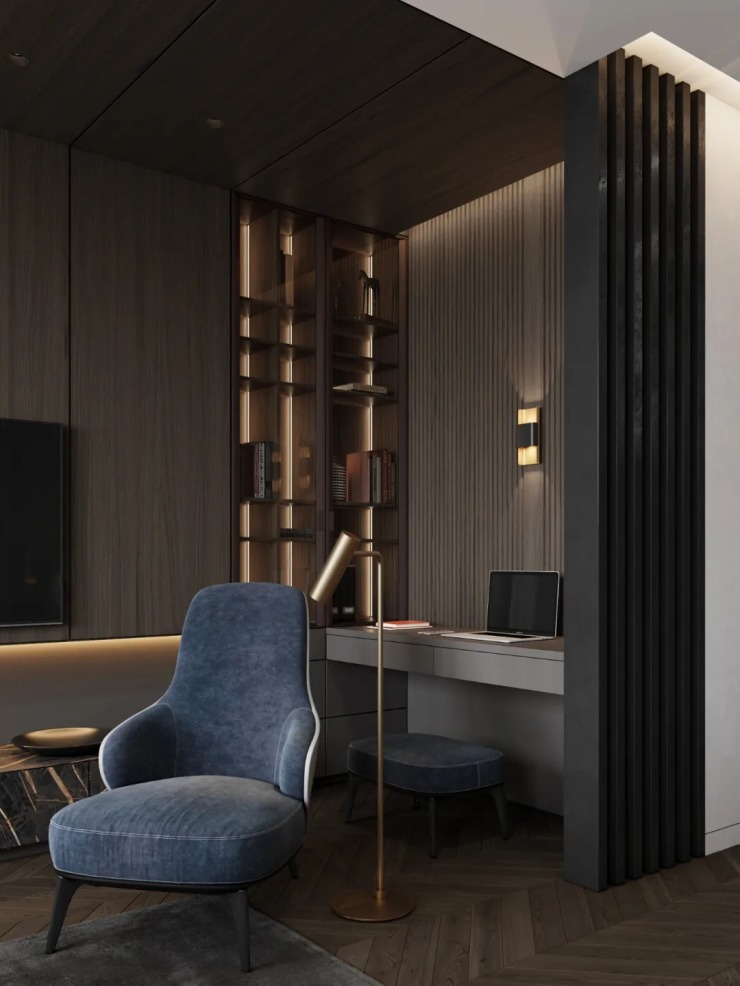 本案室内以深灰、浅灰、蓝色穿插交错于整个空间,加入石材与胡桃木多重材质碰撞打造出沉静现代的魅力空间。空间部分灯饰采用藏于墙内的细长灯带,散发闪耀温暖的光线精致了空间的硬朗线条,让空间看起来有着不一样的奢华高级感。