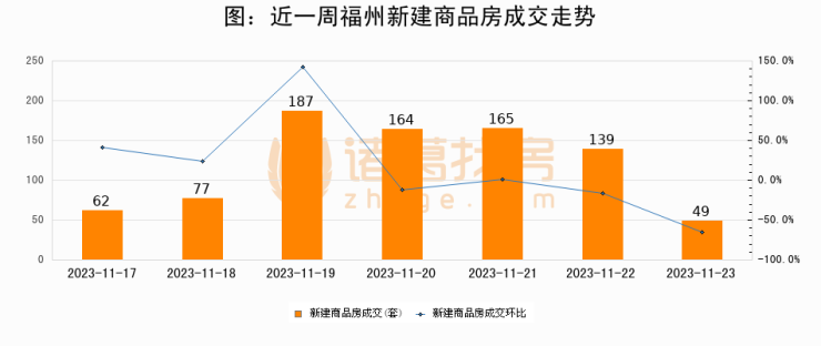 根据福州市不动产登记和交易中心数据显示,2023年11月23日福州新建商品房成交49套,较昨日减少90套,环比下降64.8%