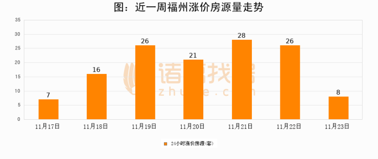 根据诸葛找房数据显示,福州24小时涨价房源量为8套,较11月22日减少18套,环比下降69.2%。与此同时,涨价房源占比小幅回落,对于购房者来说是一个入市窗口期,购房者可抓住时机入市。