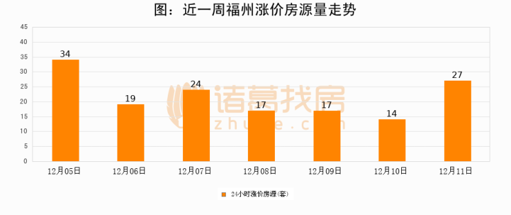 根据诸葛找房数据显示,福州24小时涨价房源量为27套,较12月10日增加13套,环比上涨92.9%。与此同时,涨价房源占比小幅扩大,业主信心有所提升。