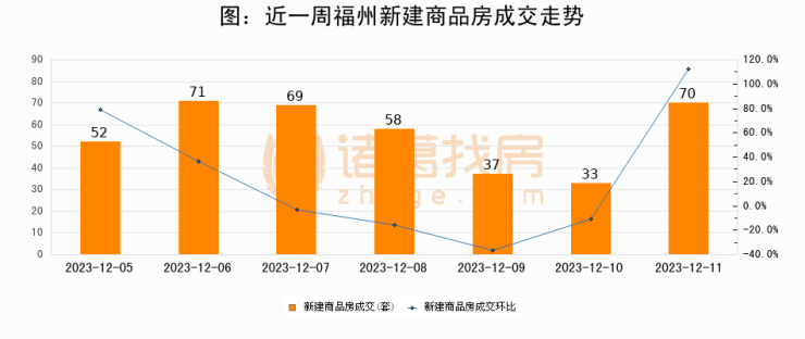 根据福州市不动产登记和交易中心数据显示,2023年12月11日福州新建商品房成交70套,较昨日增加37套,环比上涨112.1%