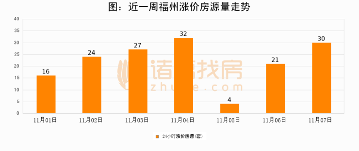 根据诸葛找房数据显示,福州24小时涨价房源量为30套,较11月06日增加9套,环比上涨42.9%。与此同时,涨价房源占比小幅扩大,业主信心有所提升。
