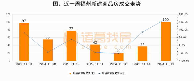 根据福州市不动产登记和交易中心数据显示,2023年11月14日福州新建商品房成交100套,较昨日增加63套,环比上涨170.3%