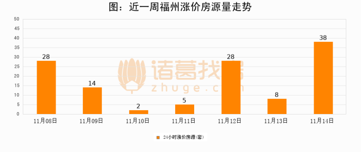 根据诸葛找房数据显示,福州24小时涨价房源量为38套,较11月13日增加30套,环比上涨375%。与此同时,涨价房源占比小幅扩大,业主信心有所提升。