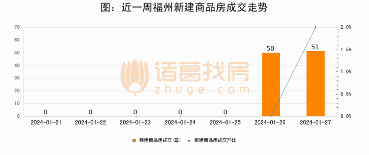 根据福州市不动产登记和交易中心数据显示,2024年01月27日福州新建商品房成交51套,较昨日增加1套,环比上涨2%