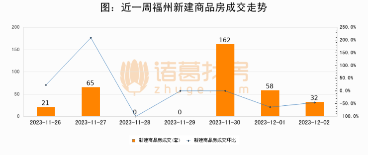 根据福州市不动产登记和交易中心数据显示,2023年12月02日福州新建商品房成交32套,较昨日减少26套,环比下降44.8%