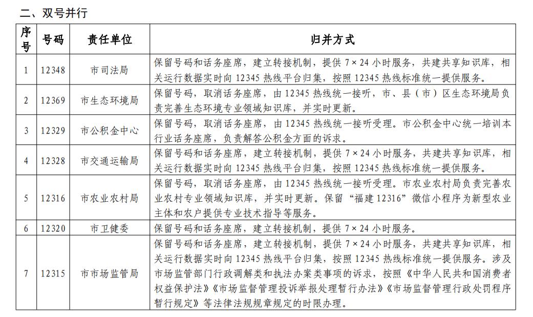 (二)双号并行。分为保留座席和取消座席两类。保留座席的,与12345热线建立电话转接机制,提供“7×24小时”全天候人工服务,共建共享知识库,相关运行数据实时向12345热线平台归集,按照12345热线标准统一提供服务;取消座席的,由12345热线座席统一接听、按责转办。