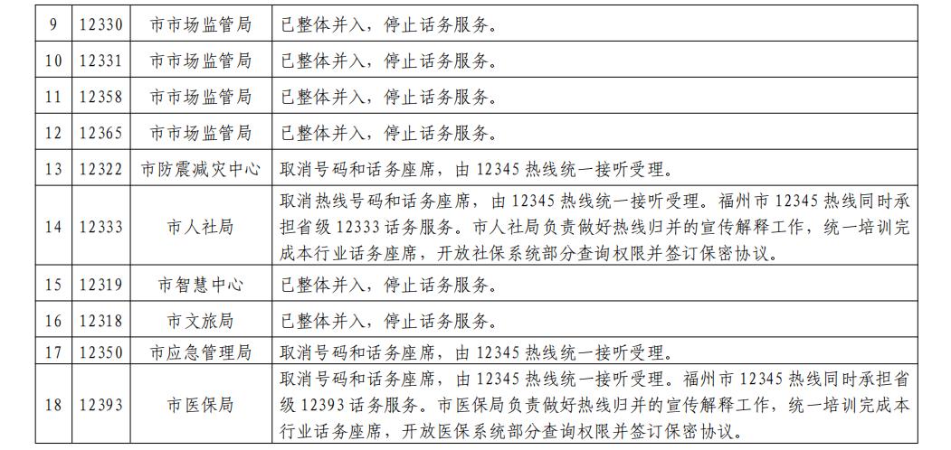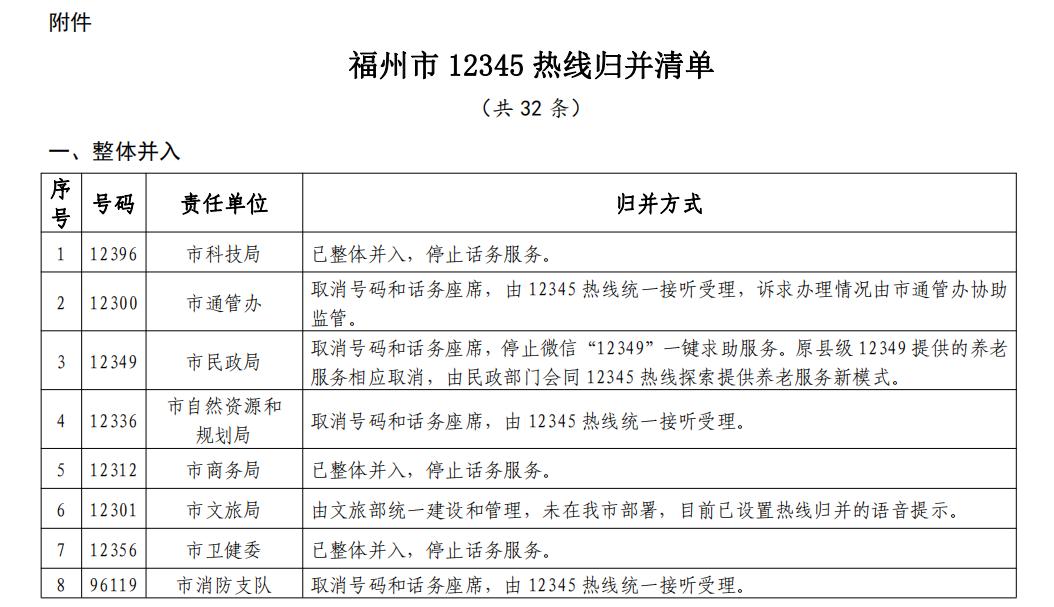 (一)整体并入。取消号码,整体并入12345热线,由12345热线负责统一接听、按责转办。已经取消的热线号码不再恢复。