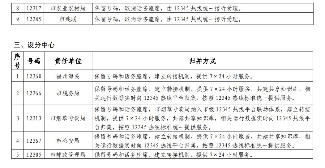 加快推进除110、119、120、122等紧急热线外的政务服务便民热线归并,2021年11月底前,福州设立的政务服务便民热线以及国务院有关部门设立并在福州接听的政务服务便民热线实现一个号码服务,归并后的热线统一为“12345政务服务便民热线”(以下简称,12345热线),语音呼叫号码为“12345”,提供“7×24小时”全天候人工服务。同时,进一步建立健全12345热线的管理体制机制,建设数字化、专业化、立体化的12345热线服务系统,丰富受理方式,优化服务功能,完善运行机制,确保企业和群众反映的问题和合理诉求及时得到处置和办理,使政务服务便民热线接得更快、分得更准、办得更实,打造便捷、高效、规范、智慧的政务服务“总客服”。