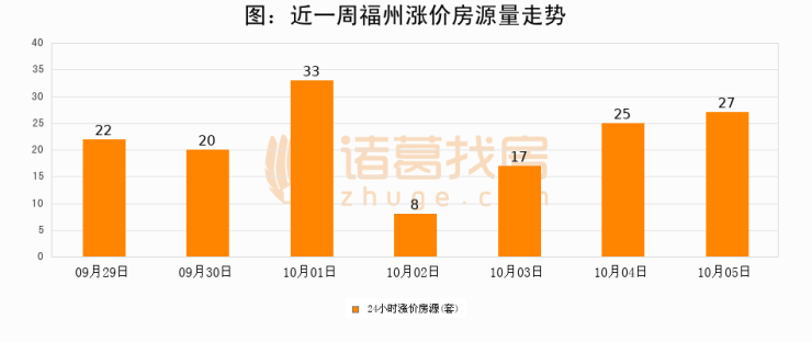 根据诸葛找房数据显示,福州24小时涨价房源量为27套,较10月04日增加2套,环比上涨8%。与此同时,涨价房源占比小幅扩大,业主信心有所提升。