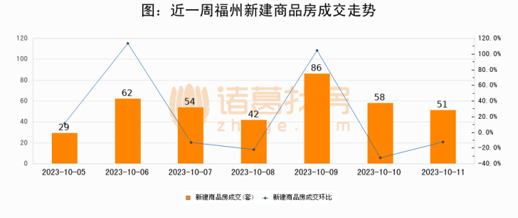 根据福州市不动产登记和交易中心数据显示,2023年10月11日福州新建商品房成交51套,较昨日减少7套,环比下降12.1%