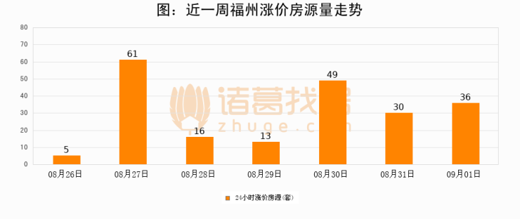 根据诸葛找房数据显示,福州24小时涨价房源量为36套,较08月31日增加6套,环比上涨20%。与此同时,涨价房源占比小幅扩大,业主信心有所提升。