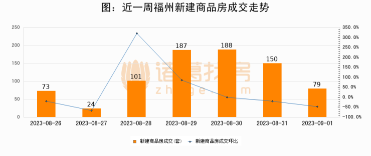 根据福州市不动产登记和交易中心数据显示,2023年09月01日福州新建商品房成交79套,较昨日减少71套,环比下降47.3%