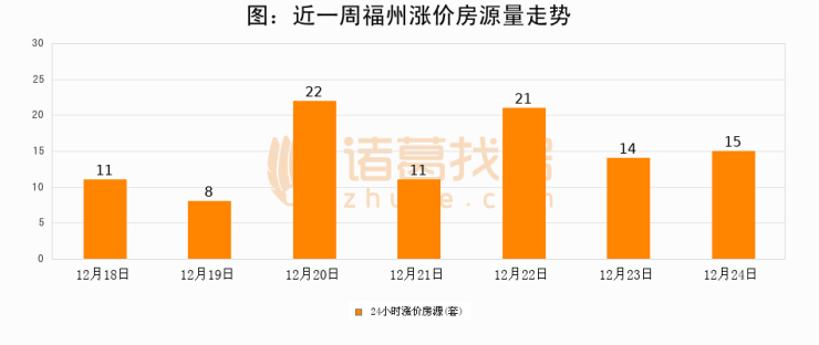 根据诸葛找房数据显示,福州24小时涨价房源量为15套,较12月23日增加1套,环比上涨7.1%。与此同时,涨价房源占比小幅扩大,业主信心有所提升。