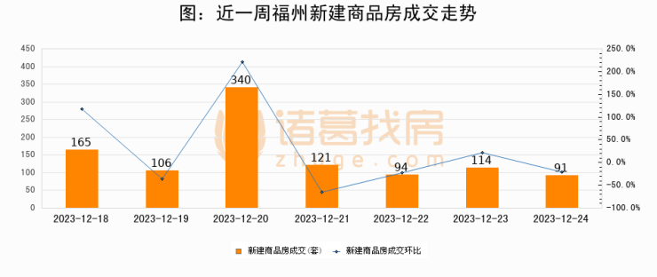 根据福州市不动产登记和交易中心数据显示,2023年12月24日福州新建商品房成交91套,较昨日减少23套,环比下降20.2%