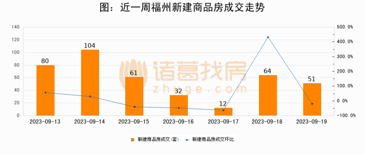 根据福州市不动产登记和交易中心数据显示,2023年09月19日福州新建商品房成交51套,较昨日减少13套,环比下降20.3%