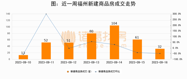 根据福州市不动产登记和交易中心数据显示,2023年09月16日福州新建商品房成交32套,较昨日减少29套,环比下降47.5%