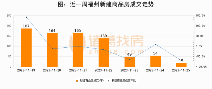 根据福州市不动产登记和交易中心数据显示,2023年11月25日福州新建商品房成交17套,较昨日减少37套,环比下降68.5%